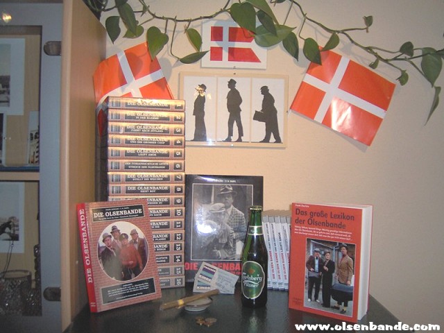 Auf dem Tresor liegt Michaels Olsenbandensammlung: Dänemarkfähnchen, Fanbuch, Lexikon, Silhouette, Carlsberg Bier, eine Zigarre, Videokassetten und 2 Kinokarten. Aber Moment mal, zurück, ist euch auf dem Foto etwas aufgefallen? Ja, richtig das sind 16 Videos! Der Schwarzkopf und Schwarzkopf Verlag hat aber nur 14 Filme veröffentlicht und Olsenbande Junior gibt es nur auf DVD.