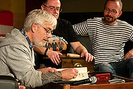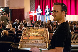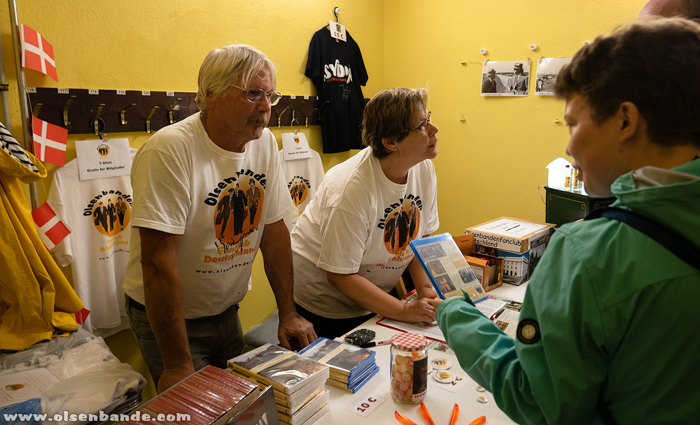 Frank und Steffen übernahmen die Auslosung des Gewinnspiels und machten es extrem spannend. Der glückliche Gewinner des ersten Loses bekam die neue Jubiläums-DVD-Box, gesponsert von Icestorm. Auch die weiteren Preise waren sehr begehrt: eine Jubiläums-Tuborg-Flasche von Nordisk Film, die Biografie von Poul Bundgaard und das Buch "Mächtig gewaltig! Die Olsenbande im Museum". Auch hier ging der Erlös aus dem Losverkauf an das Stellwerksprojekt.