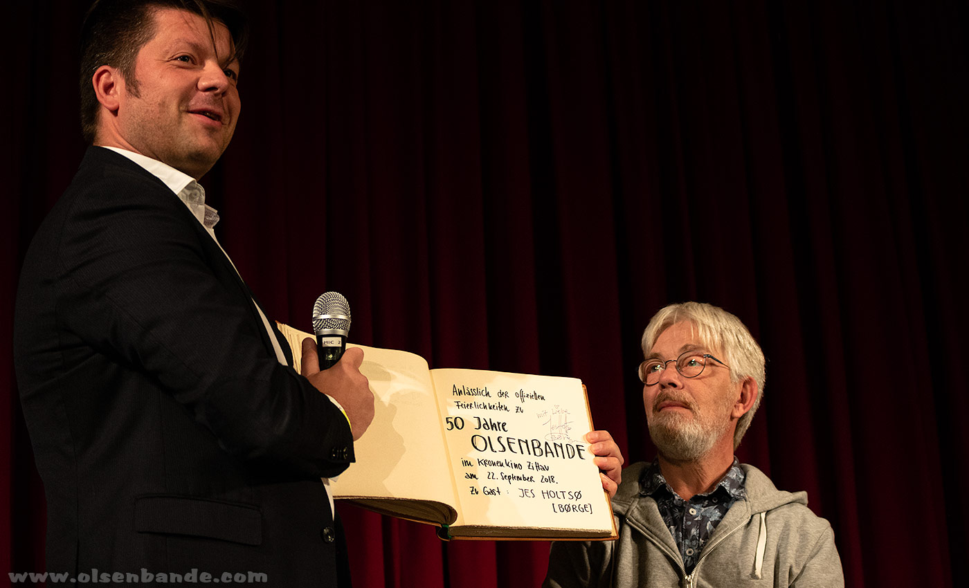 Ein Höhepunkt des Wochenendes war für die meisten sicherlich das Podiumsgespräch mit Jes Holtsø, Janine Strahl-Oesterreich, Frank Eberlein und Steffen Paatz. Jes wurde begeistert auf der Bühne empfangen, doch bevor es losging gab es noch eine weitere Überraschung. Der Oberbürgermeister Thomas Zenker war mit dem goldenen Buch der Stadt Zittau vorbeigekommen und Jes durfte sich darin verewigen.