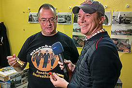 Den Fanclubstand teilten wir uns mit der örtlichen Buchhandlung, sodass es einige Fanartikel im Angebot gab. Bei uns drehte sich wieder viel um das Stellwerk der Olsenbande mit dem Dokufilm als DVD/Blu-Ray, 3D-Modell und ganz neu: Stellwerks-Schnaps! Fanclubmitglied Franz Sieber hat in seinem Traditionsbetrieb im erzgebirgischen Lauterbach eine Kleinserie von 200 Stück für uns angefertigt. Dafür interessierte sich sogar das MDR-Fernsehen. Alle Erlöse kommen der zweiten Projektphase des Stellwerks - dem Neubau des Seitengebäudes zugute.
