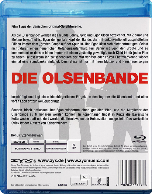 Nachdem die Firma ZYX bereits unzählige DVD-Editionen veröffentlicht hat, begann man 2011 damit die Olsenbandenfilme auf Blu-Ray herauszugeben. Man hat es aber nicht über den ersten Film hinausgeschafft. Die Bildqualität ist fast auf dem Niveau der dänischen Ausgabe, wenn auch nur in MPEG-2 codiert. Ungewöhnlich ist, dass man hier weder den DEFA-Mauervorspann noch den dänischen Vorspann verwendet hat. Stattdessen wurde ein völlig neuer Vorspann mit dem deutschen Text erstellt. Im Hintergrund sieht man dazu ein Standbild des Gefängnisses, dass durch neu eingefügte Ruckler und Filmschmutz eine Bewegung vortäuscht.