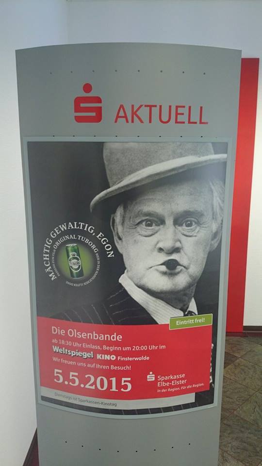 Am 28.05.2013 zeigt das Kino Weltspiegel in Finsterwalde den Film "Die Olsenbande sieht rot". Mit Unterstützung der Sparkasse Elbe-Elster. Und jetzt kommts, die Sparkasse macht mit dem Tresor-Knackenden Egon Werbung für die Veranstaltung: