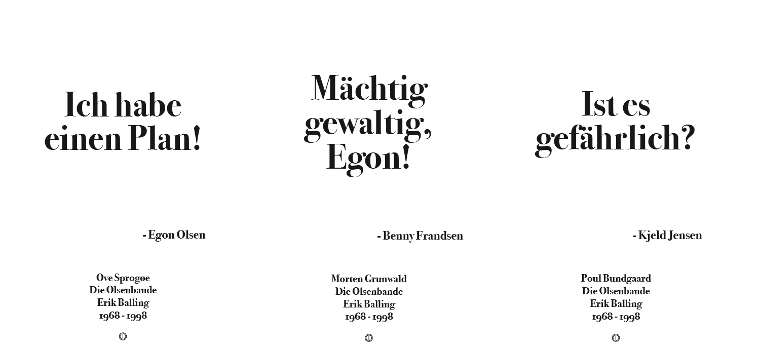 Poster mit Filmzitaten sind gerade unheimlich populär. In Dänemark hat sich die Firma Citatplakat (https://citatplakat.dk) darauf spezialisiert und verkauft natürlich auch viele Plakate mit Sprüchen aus den Olsenbandenfilmen. Die Produkte sind selbstverständlich alle von Nordisk Film abgesegnet und lizenziert.