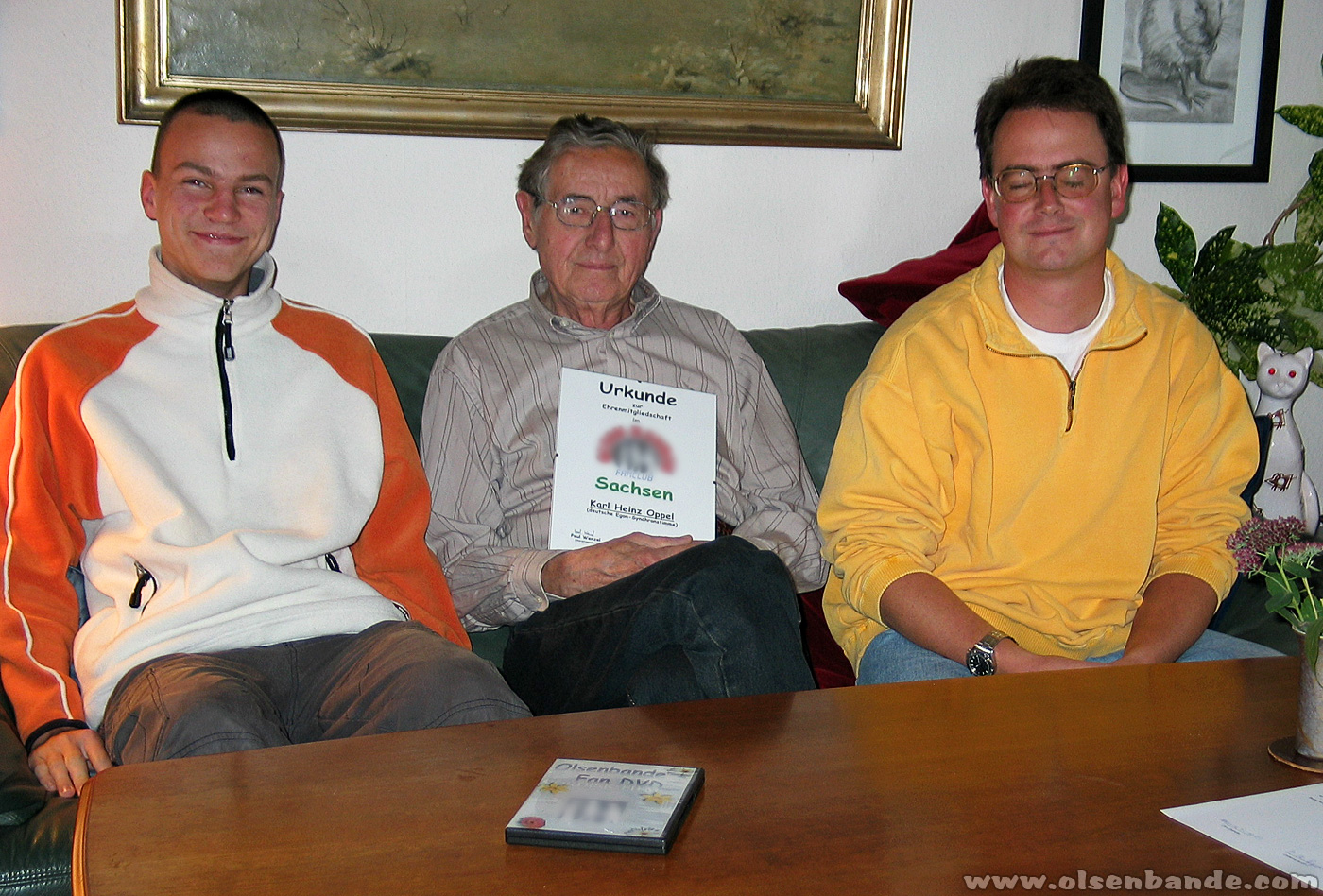K.H. Oppel: Da waren wir drei, das ist also Synchronsprecher von Egon und Kjeld und von dem Benny, bei einer Veranstaltung damals vom DDR-Fernsehen "Nacht der Prominenten", das fand statt im Winterquartier des Staatszirkus glaube ich... und in einer dieser Veranstaltungen "Nacht der Prominenten" trat die Olsenbande, diesmal also die richtig originale Olsenbande auf mit den drei Männern Egon, Kjeld und Benny. Und da hatte man sich ausgedacht, wie es denn wäre, wenn die Synchronsprecher, also die deutschen... Stimmen mit dabei wären und wir kannten uns alle nicht und die kamen und wir drei Synchronsprecher, das war der Peter Dommisch, verstorben, Erhard Köster und ich war es selber, wir wurden dort hinbestellt, um ein kennen lernen gegenseitig zu ermöglichen und da habe ich eben den Ove Sprogøe, Schauspieler von Egon Olsen erstmals kennen gelernt. Und es war eine sehr aufgeschlossene Begegnung, auch mit den anderen, die übrigens alle drei die deutsche Sprache erstaunlich gut beherrschten.