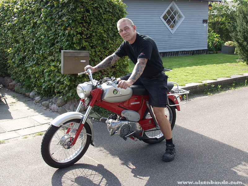 "Ja, das habe ich selbst gemacht. 'Kannst du durch einen Bretterzaun fahren', fragten sie, und das konnte ich ohne weiteres. Ich hatte Erfahrung damit, da ich um die 11 war, als ich angefangen habe Moped zu fahren. Wenn man sich mit seiner Puch in die Seite legte, konnte man schnell auf engen Wegen und an ähnlichen Stellen durchschlüpfen. Und dann erinnerte man sich in der Regel daran, anzuhalten und der Polizei zu winken, die hinter einem her war", klärte Jes Holtsø auf, als Bagsiden gestern sah, wie er zum Ehrenmitglied des Puchklub.dk ernannt wurde. "Wir nahmen die Szene mit dem Bretterzaun 3-4 mal auf und ich fiel jedes mal hin. Dahinter waren nur etwa drei Meter zum Bremsen und das war ein Hinterhof, wo es schattig war und deshalb voller Moos war, so war es wahnsinnig glatt. Ich fuhr meistens ohne Helm, aber sie sagten, dass ich es soll. Und das war gut, da ich anschließend auf den Helm sah, der hatte vorn eine ordentliche Kerbe bekommen", sagt er. Jes Holtsø war in zehn Olsenbandenfilmen dabei und auch in Rollen, wie Herr und Frau Olsens Sohn William in "Oh, diese Mieter!" lieferte er eine Menge an gediegenen Puch-Fahrten.