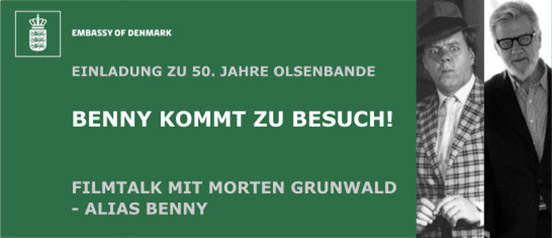 Aus Anlass des 50. Jubiläums der Olsenbande lädt die Dänische Botschaft in Berlin zu einem Filmtalk mit Benny-Darsteller Morten Grunwald. Am 5. April 2018 von 17 bis 18:30 Uhr wird er gemeinsam mit Janine Strahl-Oesterreich und Jesper Schou-Knudsen auf der Bühne sein. Die Begrüßungsansprache hält Friis Arne Petersen, der Botschafter des Königreichs Dänemark.