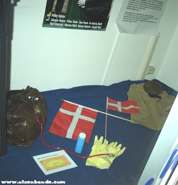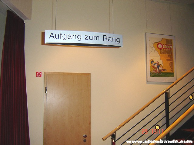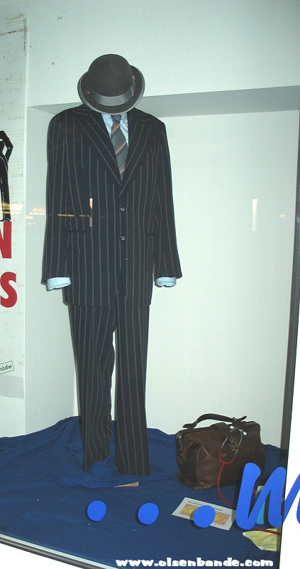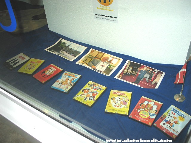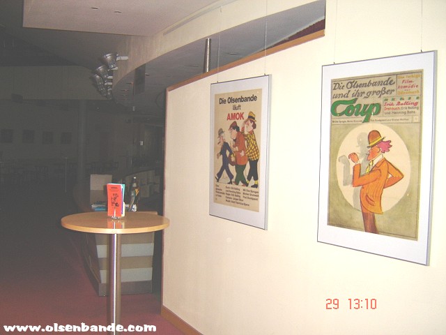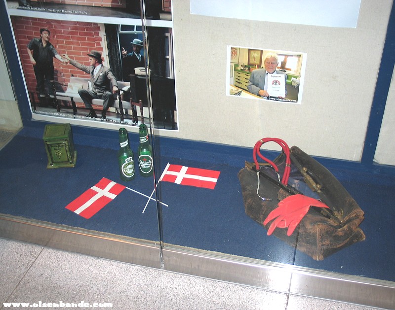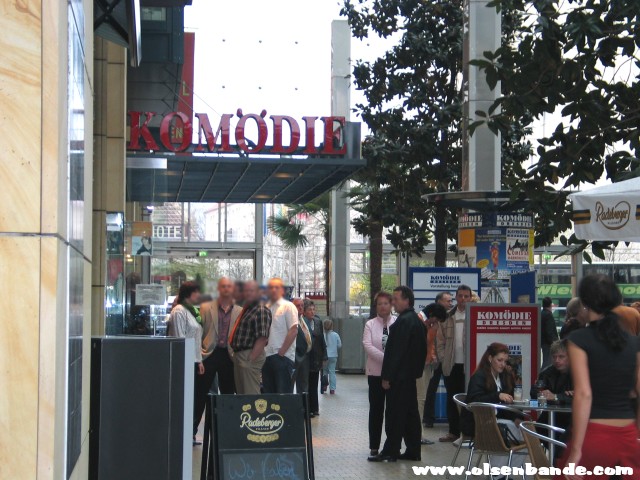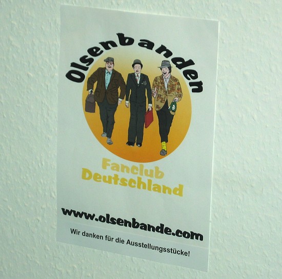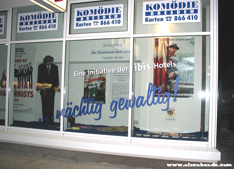 Wir sind auf Einladung der Komödie nach Dresden gereist, um uns das Stück anzusehen. Doch bevor es losging, haben wir uns die kleine Ausstellung unserer Exponate im Kassenbereich angesehen. Die Komödie bat uns im Vorfeld um Unterstützung bei den Vorbereitungen und Exponaten dafür. Ein zweiter Teil des Ausstellung befindet sich in einem Schaufenster des IBIS-Hotels in der Prager Straße. Beim Ausladen von Plakaten für eine Erweiterung der Ausstellungen am Bühneneingang, die wir Jürgen Mai (Bang Johansen) übergeben wollten hat uns freundlich Tom Pauls (Egon Olsen) begrüßt und seine Freude über unseren Besuch geäußert. Hoffentlich denkt Egon nicht, dass wir Geschäfte mit Bang Johansen machen...