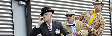 Pressemitteilung "Ich habe einen Plan!" Das Gefängnistor öffnet sich und Egon Olsen wird hinausgeworfen, Melone und Zigarre hinterher. Seine Freunde Kjeld und Benny warten draußen schon auf ihn. Egon schwört seine Bande auf einen neuen – so genialen wie todsicheren – Plan ein. An ihrem Geburtstag wird die dänische Königin eine »Hamlet«-Vorstellung im Theater besuchen und zu diesem großen Anlass ein kostbares Diadem aus dem Kronschatz tragen. Der Theaterdirektor plant, einen Stromausfall vorzutäuschen, um im Schutz der Dunkelheit die königlichen Juwelen gegen ein Duplikat auszutauschen. Ein texanischer Gangster bietet ihm zehn Millionen für den Schmuck. Die Königin soll beklaut werden? Das geht selbst Egon zu weit! Er und seine Männer kämpfen für die Königin und wollen nebenbei noch den miesen Texaner übertölpeln. Die Millionen können sie gut gebrauchen, denn Kjelds Frau Yvonne wird Großmutter und ihr Sohn Börge und seine Braut Fie wollen heiraten. Der Wagen ist getankt, auf zum Theater! Kjeld spielt Hamlet, Benny doubelt den Direktor, Egon dirigiert – da setzen Fies Wehen ein und die Ereignisse überschlagen sich mächtig gewaltig... Die Rostocker Schauspieler Dirk Donat und Peter Grünig haben aus den beliebten Filmen der »Olsenbande« einen rasanten Theatercoup für die Bühne geschrieben. Liebhaber der legendären Kleinganoven aus Dänemark werden einige der schönsten Filmgags wiedererkennen. Gespräch mit der Regisseurin Uta Koschel (UK) und den Schauspielern Silvio Hildebrandt (SH) und Andreas Guglielmetti (AG). Was verbindet ihr mit den Olsenbande-Filmen? SH: Unbedingt meine Kindheit. Auf den nächsten Film war ich immer sehr gespannt; es dauerte ja ein ganzes Jahr, bis der ins Fernsehen kam. Ich fand die drei schräg und witzig und hätte es ihnen gegönnt, dass einer ihrer Coups endlich mal klappt. Das war immer alles so toll ausgedacht und am Schluss hing's dann an irgendeinem Mist. Damals hab ich die Hoffnung nicht aufgegeben, dass sie das nächste Mal an ihre Million bestimmt rankommen. UK: Ich denke dabei auch an Weihnachten. Familie. Mit Oma und Onkel und Cousin vor der Glotze sitzen und darüber lachen, wie der Plan diesmal scheitert. AG: In der Schweiz kannten wir die Olsenbande überhaupt nicht. In Deutschland dann merkte ich, dass das im Osten absoluter Kult war, alle Leute haben davon geschwärmt. Für mich war dieses Phänomen vergleichbar mit dem, was uns damals die "Winnetou"-Filme bedeutet haben. SH: Mir hat auch gefallen, dass die Olsenbande so unkonventionell gelebt hat. Bei denen war immer was los, da gab's keinen langweiligen Alltag. Die Yvonne hatte ich übrigens viel schriller in Erinnerung als sie mir jetzt beim Wiedersehen der Filme erschien. Ich dachte eigentlich, dass sie ständig mit den Augen rollte, was sie gar nicht tut in den Filmen. Was ist das Besondere an dieser Olsenbanden-Version für die Bühne? AG: Diese Version hat einen ganz eigenen Coup, kopiert also nicht eine spezielle Folge der Filme. Aus Versatzstücken, die man durchaus wiedererkennt, entsteht ein neuer Plan. Und der hat seinen großen Show-down direkt auf einer Theaterbühne. Auch ein Theaterdirektor ist in das Verbrechen verwickelt. Das ist für uns als Schauspieler der besondere Reiz dieser Version: die Olsenbande im doppelten Sinn direkt im Theater. Welchen Figuren begegnen wir noch außer Egon, Kjeld und Benny? UK: Was wäre die Olsenbande ohne Yvonne?! Und natürlich Börge und die kleine Fie. Unsere Kommissare heißen Mortensen und Gunnarson, sie erinnern aber sehr an Jensen und Holm und an ihren Kampf um die Beförderung. Und dann ist da natürlich noch die Gegenseite, die wirklich brutalen und gefährlichen Verbrecher. Also der schon erwähnte Theaterdirektor, dann noch ein amerikanischer Gangster mit dem ominösen Namen Mister X und der Handlanger schlechthin: das Dumme Schwein. Tja, und vielleicht wird auch die dänische Königin dem Theater einen Besuch abstatten... Worauf seid ihr am meisten gespannt? SH: Ich freue mich sehr auf meine Rolle. Sofort auf der ersten Probe hat es zwischen den Schauspielern gezündet - vielleicht macht das Spielen hier so großen Spaß, weil das so kräftige Figuren sind, und auch, weil wir die Typen ja irgendwo schon seit Jahrzehnten so genau kennen... AG: Mir gefällt der skandinavische Humor: Das ist eine wirklich übertrieben Spielweise, die dabei sehr liebenswert ist. Und diese sehr verdrehten, schrägen Charaktere. UK: In erster Linie bin ich natürlich auf die Schauspieler gespannt, wie sie sich ihren Figuren nähern. Und nicht zu vergessen: die Musik. Wir werden das berühmte Olsenbanden-Motiv in den verschiedensten Variationen verwenden. (Das Interview erschien in der Theaterzeitung des Theaters Magdeburg und wurde von Heide Palmer geführt.) |